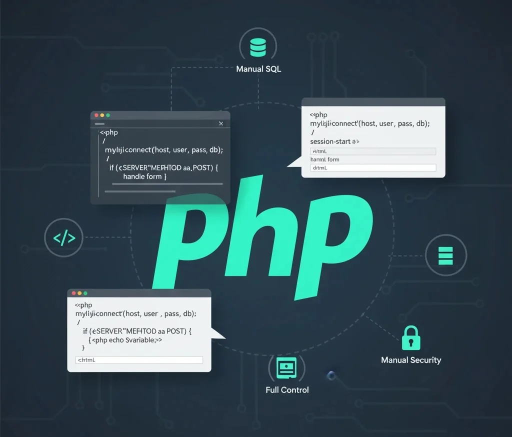 Core PHP refers to using raw PHP code without any framework or external libraries. Developers write everything from scratch – from connecting to databases, handling sessions, validating forms, to managing security.